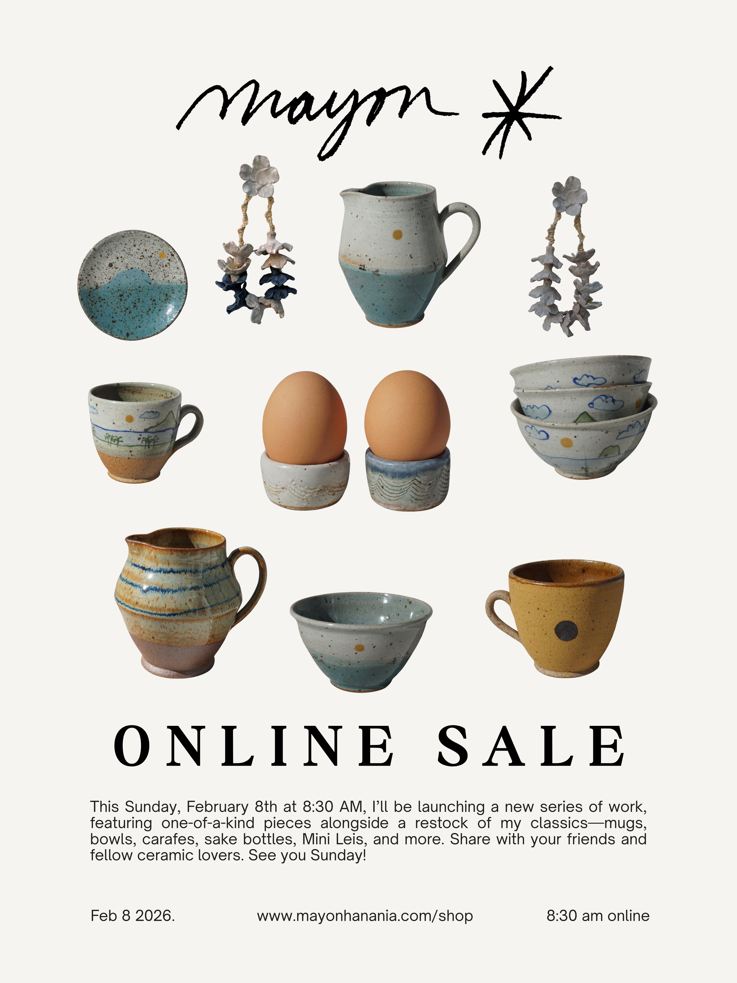 Coming soon Online Sale February 8th at 8:30 am This coming Sunday, a new series of one-of-a-kind works drops, along with new pieces and a restock of the classics. Stay tuned—and receive the newsletter first for an exclusive preview. Ceramics Paintings/Drawings Commissioned work